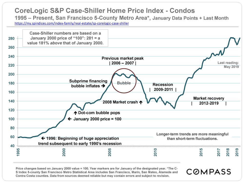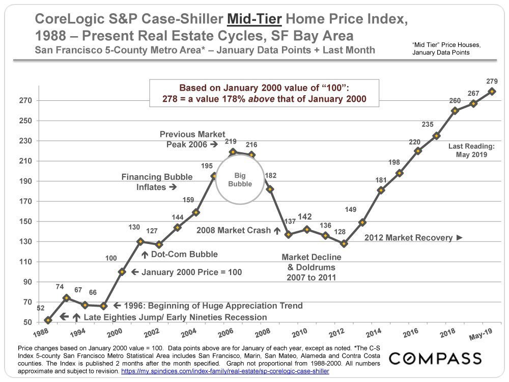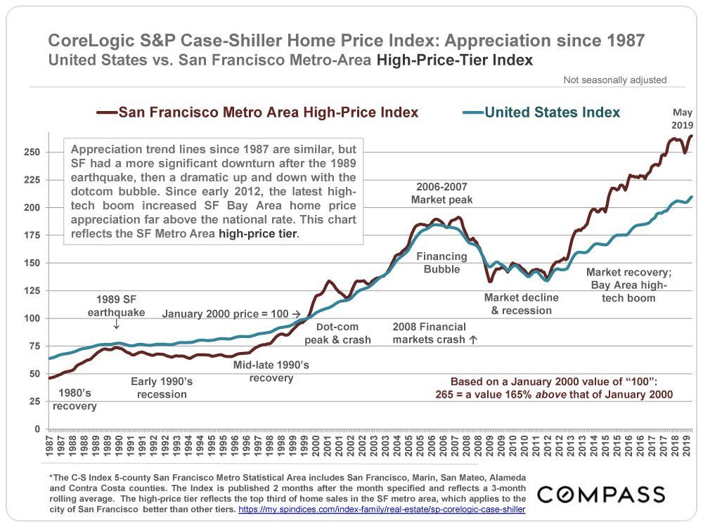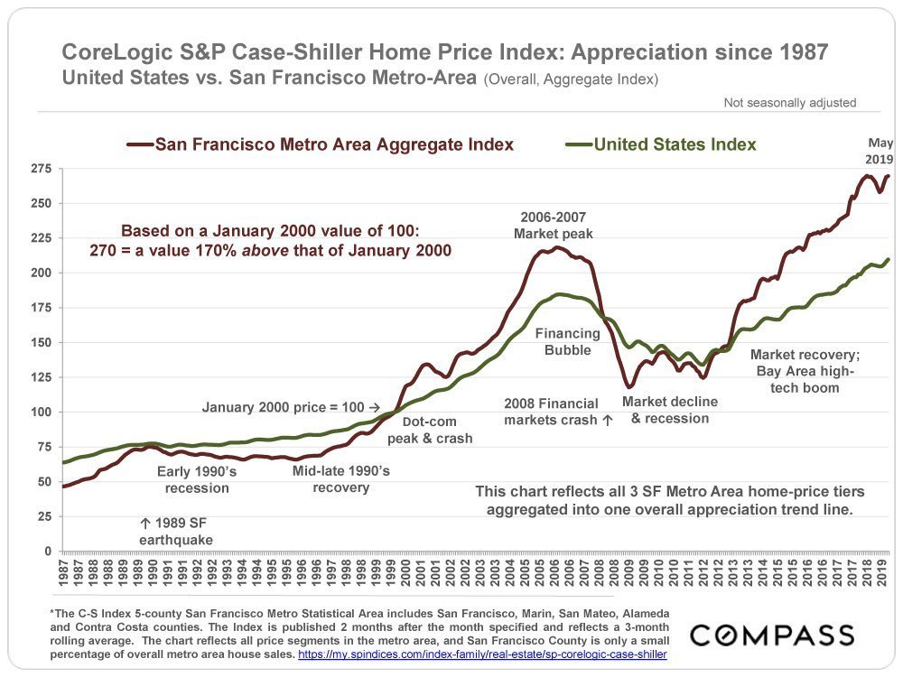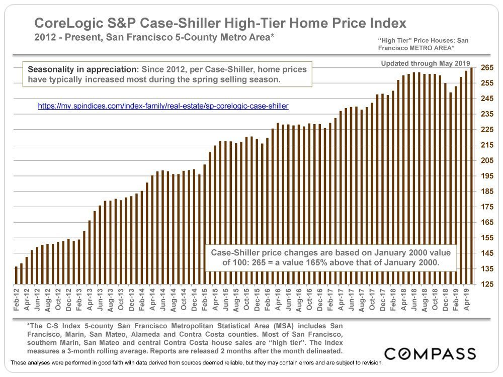 The 5 counties in our Case-Shiller Metro Statistical Area are San Francisco, Marin, San Mateo, Alameda and Contra Costa: Alameda and Contra Costa are by far the largest markets; SF itself comprises only about 7% of house sales in the metro area. We believe the Index generally applies to other Bay Area counties, such as Sonoma and Santa Clara, though those 2 have had somewhat softer markets over the past year. There are hundreds of unique real estate markets in such a broad region, with different dynamics, moving at varying speeds, sometimes in different directions. How the C-S Index applies to any particular property is impossible to know without a specific comparative market analysis.
