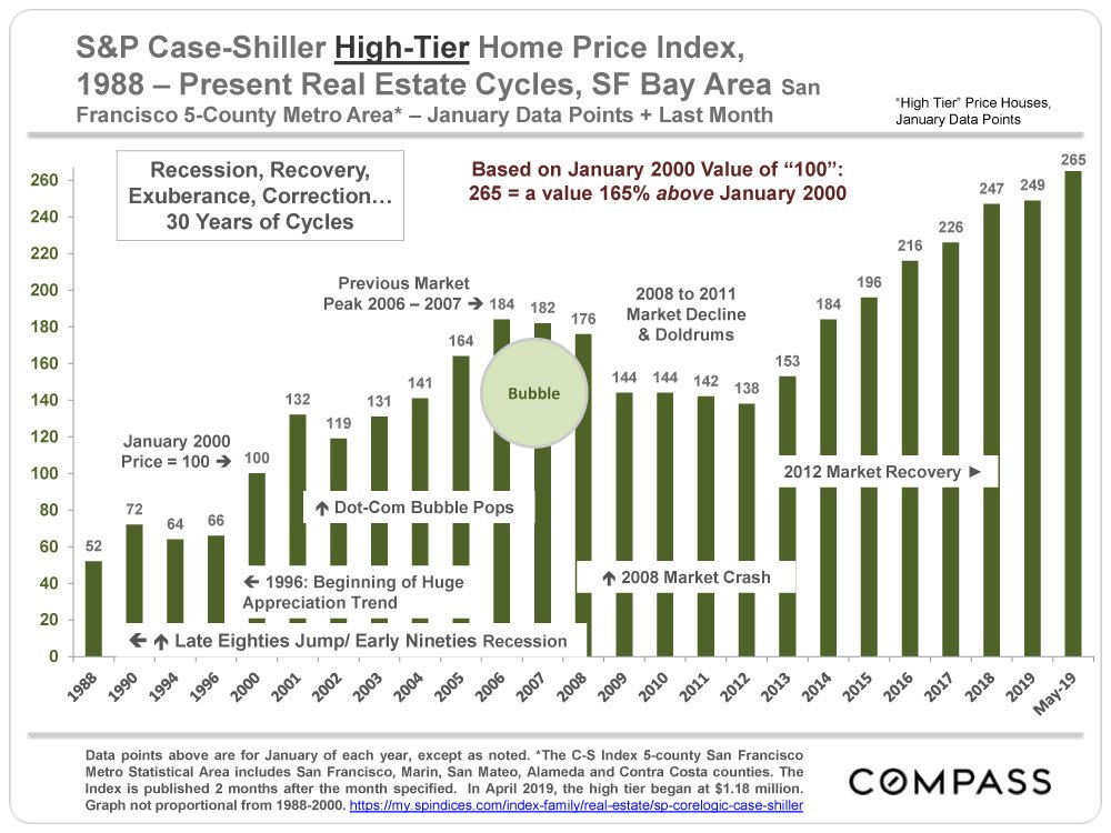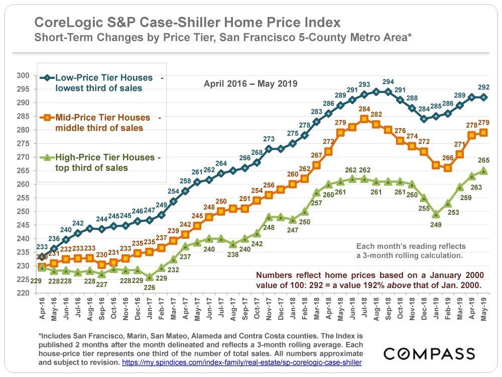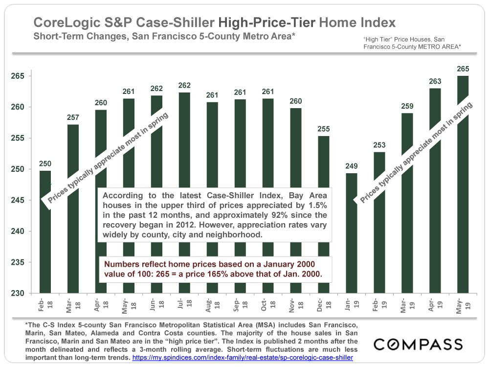 The Index is published 2 months after the month delineated – the May 2019 index was released 7/30/19 – reflects a 3- month rolling calculation, and one month’s sales generally reflect accepted-offer activity in the previous month. The Index is looking into a rear-view mirror at the market 3 to 5 months ago: The May 2019 reading, released in late July, mostly reflects market conditions in February – April 2019.