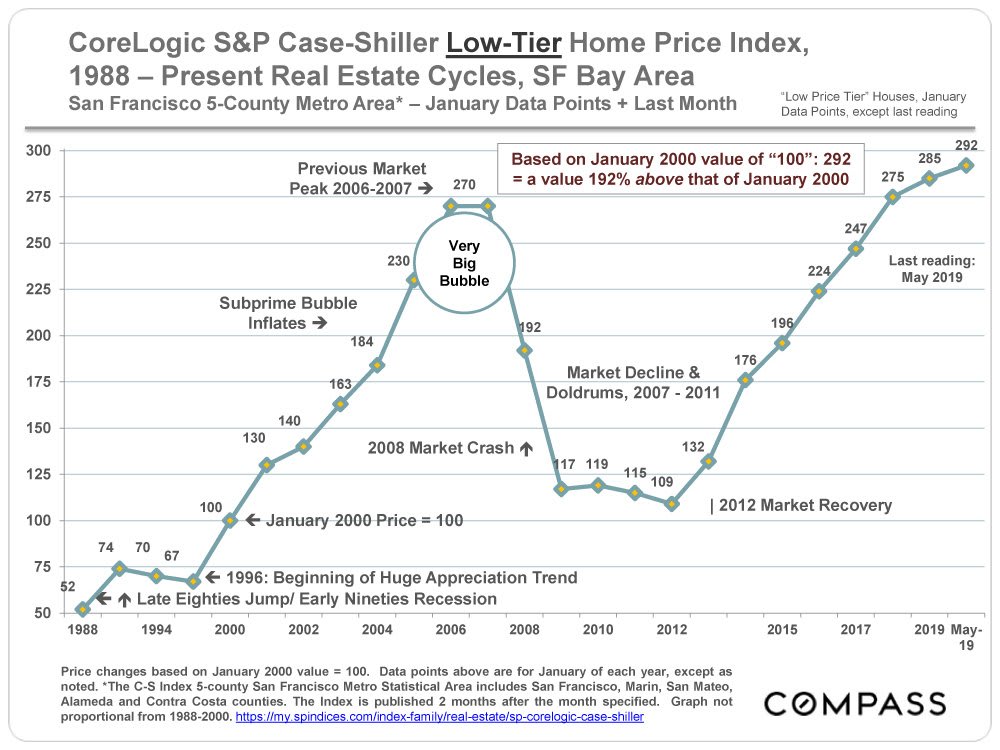 Case-Shiller divides all the house sales into thirds, or tiers: The third of sales with the lowest prices is the low-price tier; the third of sales with the highest sales prices is the high-price tier; and the third in between is the mid-price. The price ranges of these tiers change as the market changes. The 3 price tiers experienced dramatically different bubbles, crashes and recoveries over the past 18+ years, to a large degree determined by how badly the tier was affected by the subprime financing crisis. The low price tier was worst affected – huge bubble, huge crash, most dramatic recovery – and the high price least affected (but still significantly affected).