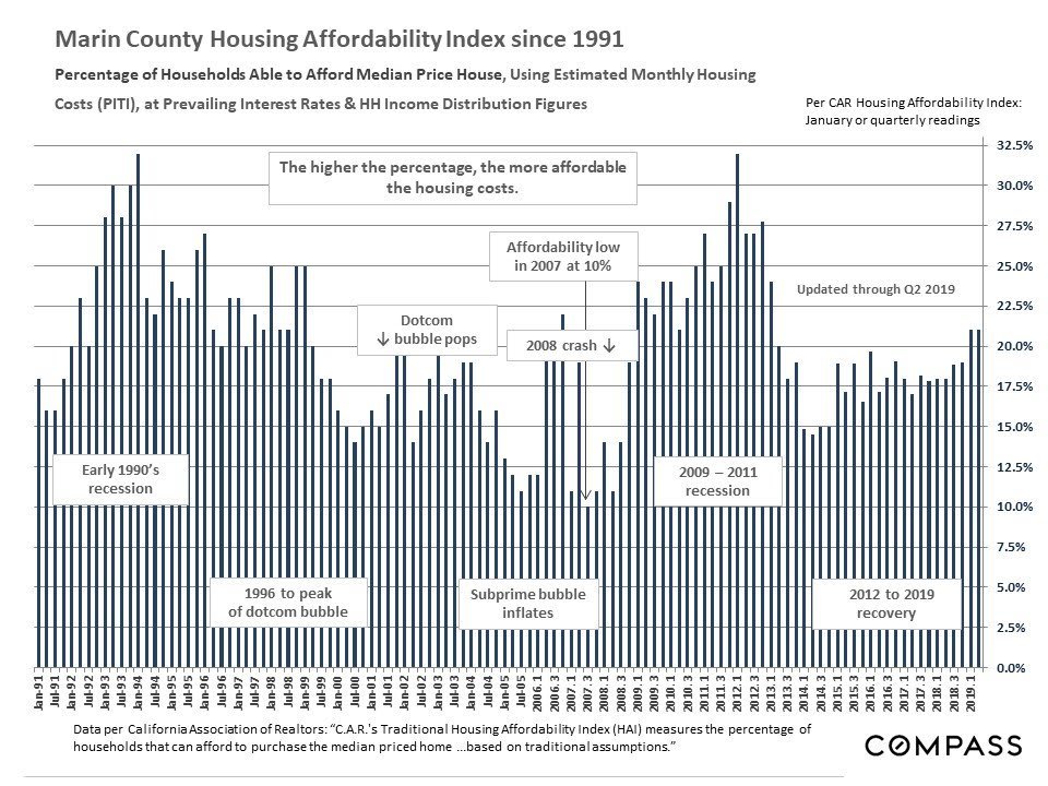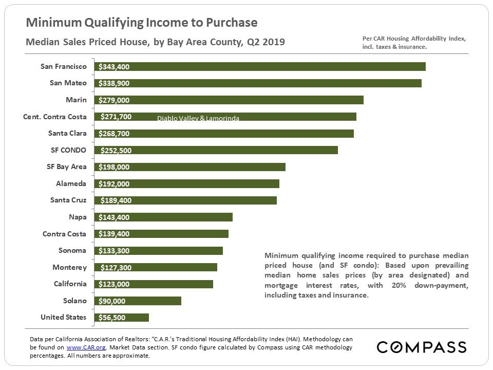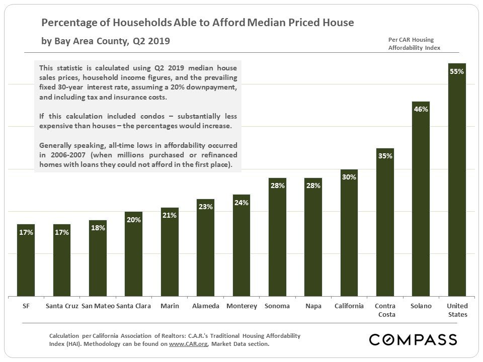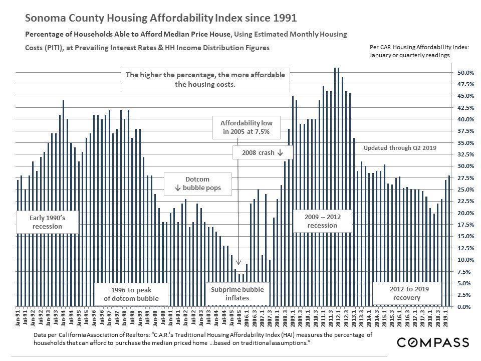 Generally speaking, affordability percentages – the percentage of county households who could afford to purchase a median-priced house – ticked up in Q2 2019 as compared to Q2 2018: Median home sales prices were relatively stable year-over-year – some counties up a bit, some down a bit, some the same – but interest rates dropped very significantly over the 12 month period. However, affordability percentages remain low by historical standards – and the Bay Area typically has among the lowest in the nation.