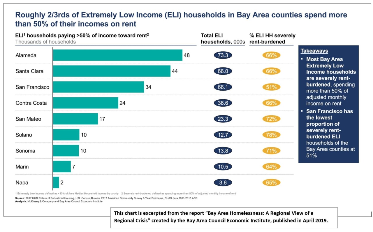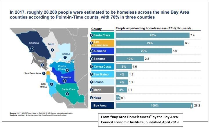 The next 2 charts are excerpted from the very in-depth report, “Bay Area Homelessness: A Regional View of a Regional Crisis” put out by Bay Area Council Economic Institute, published April 2019.