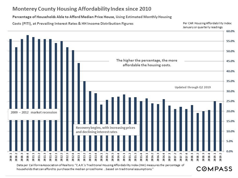 Calculations on affordability percentages, home payments and household incomes are based upon the California Association of Realtors Housing Affordability Index, measuring the percentage of county households able to afford to buy a median priced house with a 20% down-payment at prevailing mortgage interest rates.
