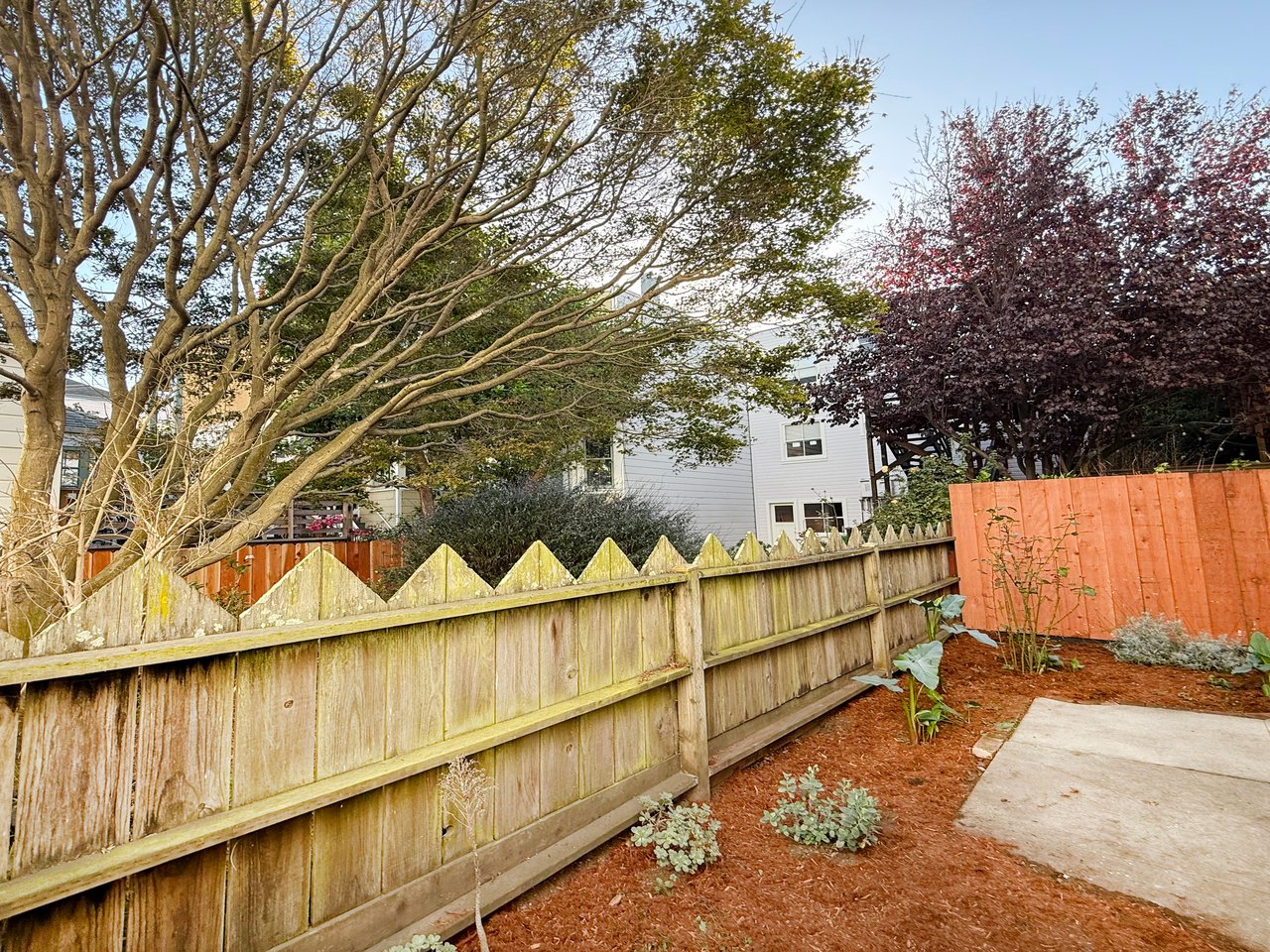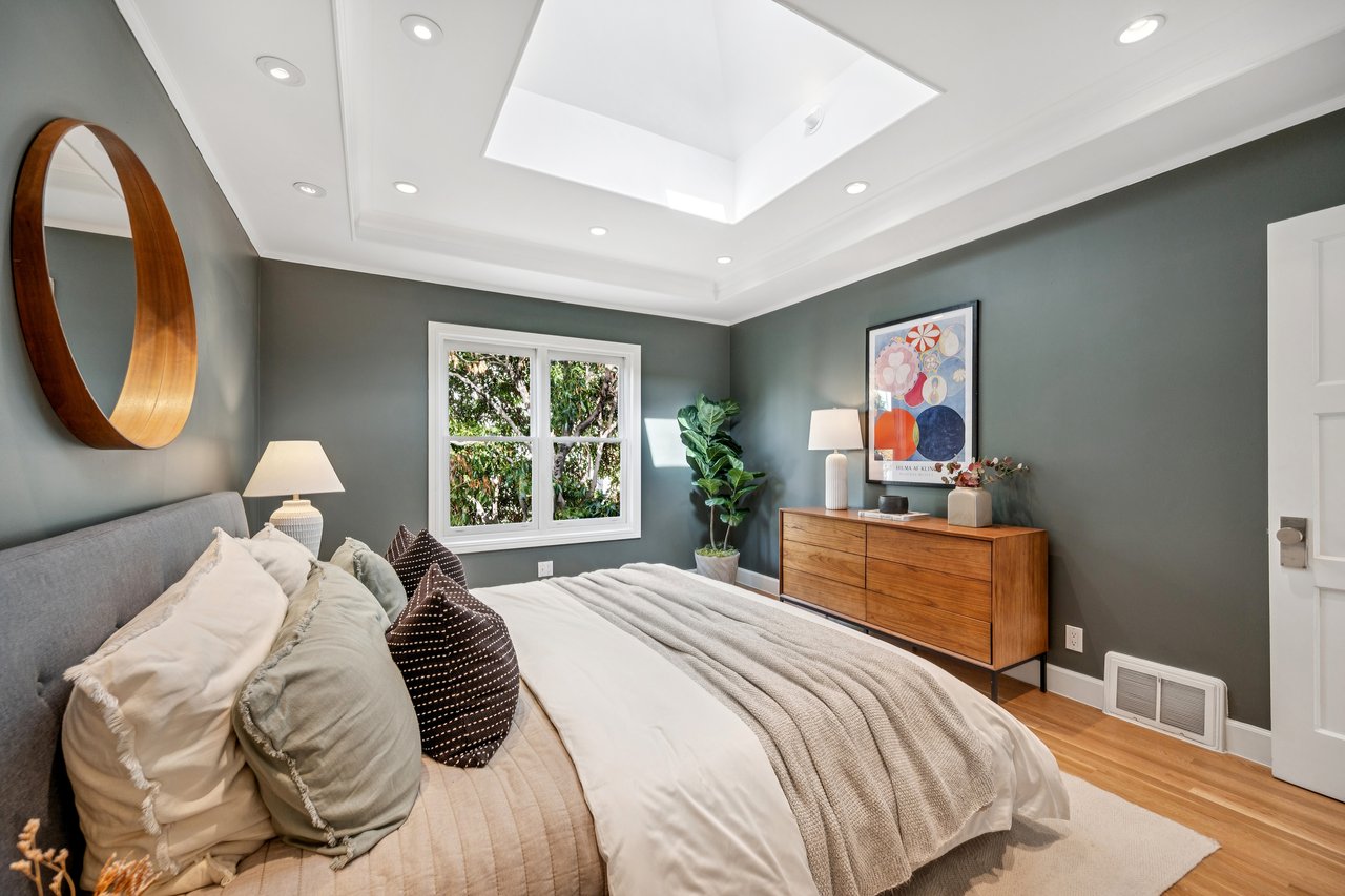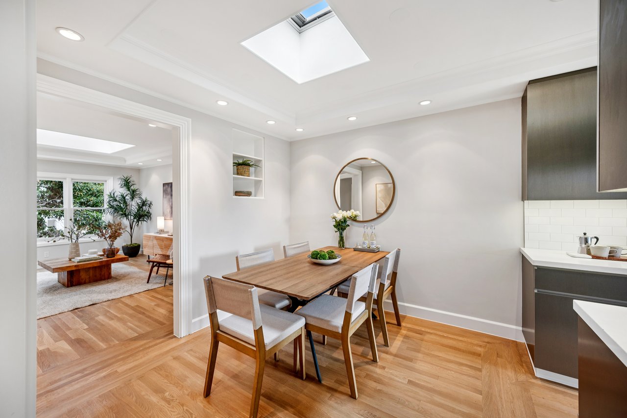 This updated full floor unit has an appealing layout with an impressive kitchen, beautiful bathroom, gorgeous wood floors, skylights, nice natural light and pleasant outlooks. The home features a spacious living room with a fireplace, dining area next to the chef's kitchen that accommodates a sizable table and 2 comfortable bedrooms. The front bedroom is large and the rear bedroom has a built-in Murphy bed and walk-out deck. The chef's kitchen has a big Miele refrigerator, Viking gas range, Viking hood, Viking microwave, pot filler and good-looking counters and cabinets. It has direct access to a staircase to the south-facing yard. The light-filled layout is wonderful for hosting friends and working from home. 2 car parking and storage in the garage. The shared yard offers space for lounging and gardening. Low HOA dues.